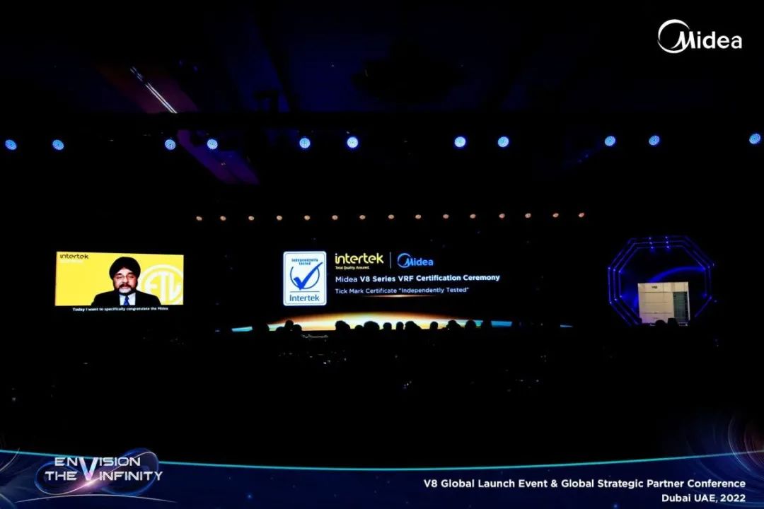 美的MDV8系列多联机凭借技术硬实力,得到了国际检测机构Intertek的多项权威认证。在美的MDV8全球发布会现场,由区域经理颁发Tick-Mark证书,以肯定美的MDV8的可靠品质。现场还收到了由Intertek相关业务部主席Saranpal Rai先生发来的祝福。