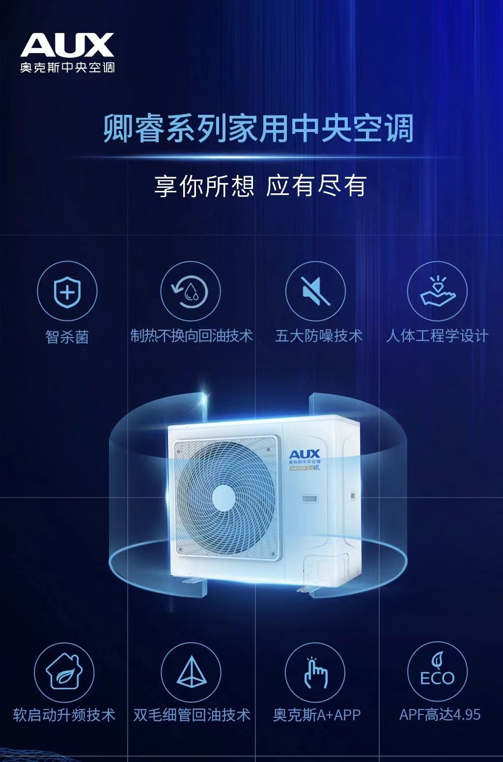 面对时代大势,针对房企和消费者需求,奥克斯中央空调应时应需,推出了卿睿系列家用中央空调解决方案——将科技融于住宅,为房企提供一站式的“优质住宅”样本,为消费者打造一个绿色、智慧、健康、安全的居住环境。