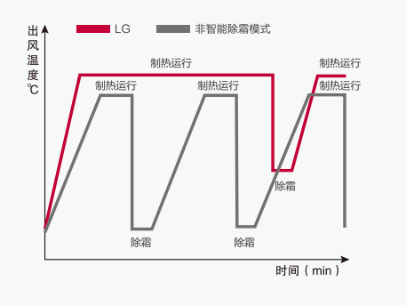 LG智能除霜功能,可根据系统温度传感器和压力传感器的共同工作(PTT技术),准确把握除霜时机对室外机进行除霜。通过调节室外机风扇转速、电子膨胀阀开度以及压缩机的运转频率,进行冷媒循环控制,搭配新型热交换器的使用,从而延缓机组结霜。