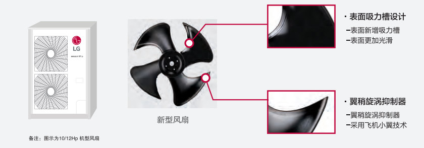 LG MULTI V S多联机采用新型风扇和优化后的导流罩,风扇表面采用表面吸力槽设计+翼稍旋涡抑制器,增加风量的同时,可大大降低运转噪音,让专心看球的球迷们不被外界打扰。