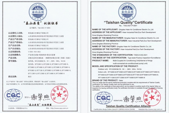 ·海尔多联机行业唯一获“泰山品质”认证