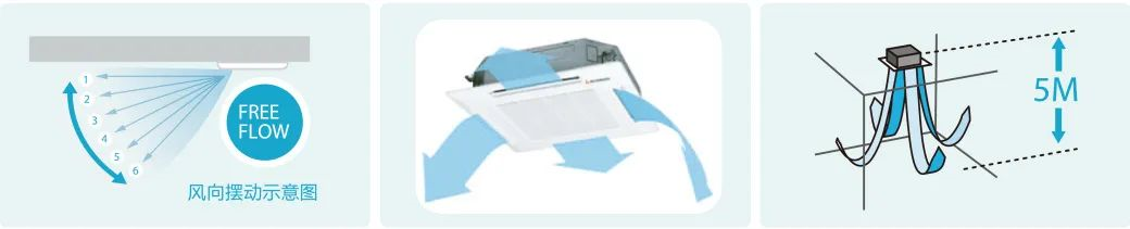 三菱重工空调KX6系列变频多联中央空调四向嵌顶式FDT室内机,搭载全新Freeflow气流控制技术,基于流体力学优化设计,实现在同一时间段四向出风、六档位组合多达1296种送风角度的自由设定,无论身处房间的任何角落,都能享受到舒适的送风角度。