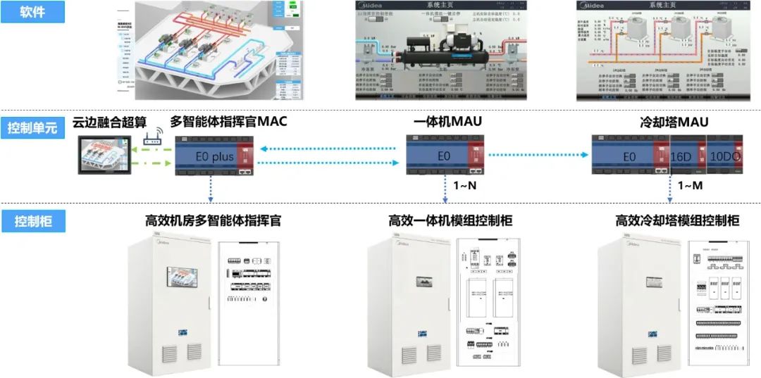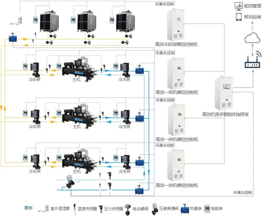提出高效机房标准化技术路径,创新性构建了一种多智能体分布式节能控制系统架构,研制了高效制冷机房的自组织模组控制单元和协同控制单元,控制系统灵活性高、算法自动适配、鲁棒性(robustness)强。
