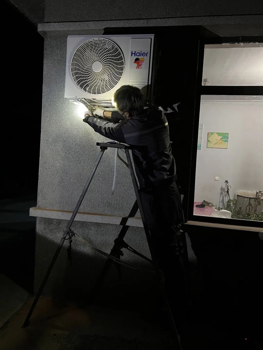 石家庄一用户家中,空调外机无落脚点,安装极其困难。海尔空调服务兵在高空与寒风作战,不负用户所托,急速完成安装。