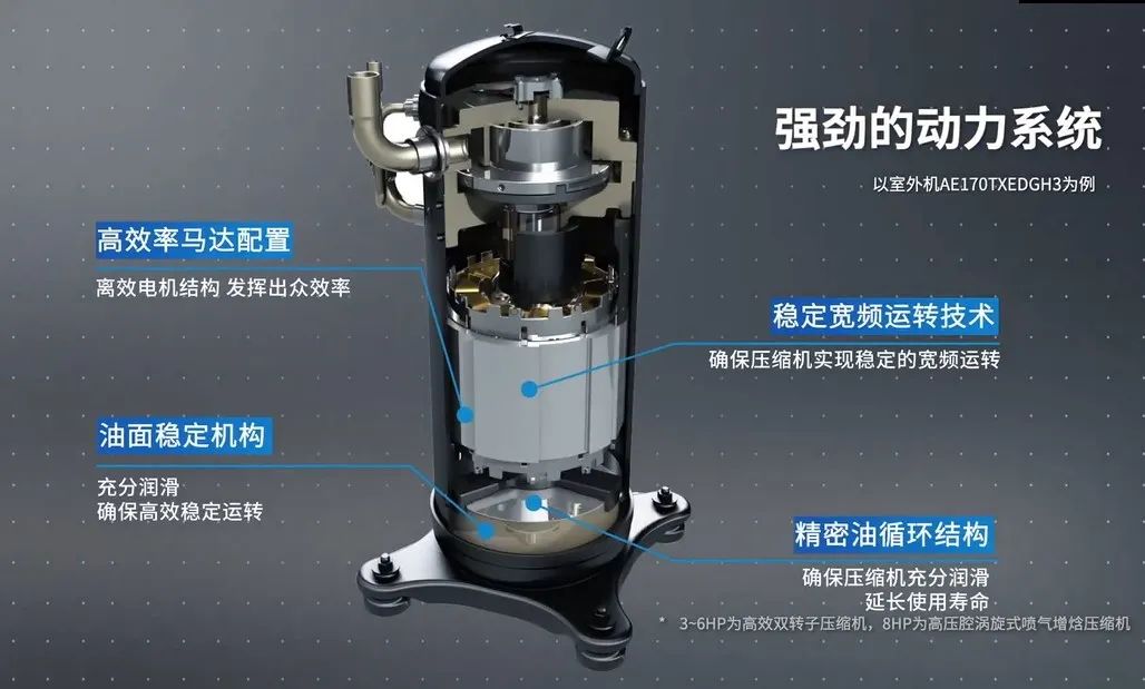 三星地暖中央空调HU产品采用空气源热泵技术通过少量电能驱动压缩机运转,实现能量的转移。同时凭借三星高压腔涡旋式增焓压缩机,采用不对称涡旋盘设计,运行高效平稳。