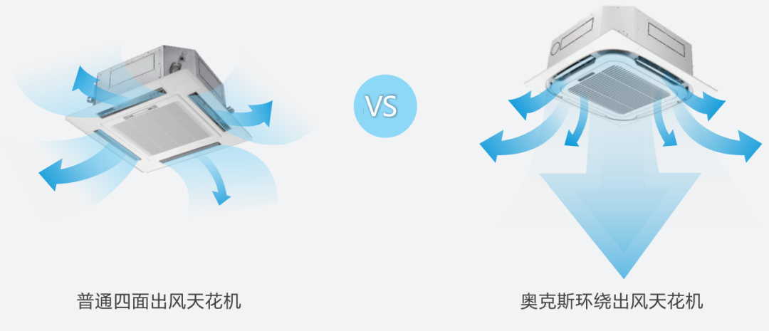 奥克斯天花机采用360°环绕出风,可实现多角度送风、超远距离送风,送风角度大,送风更精准,比传统空调覆盖率面积提升30%。