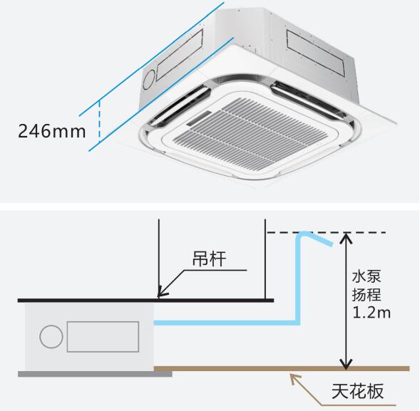奥克斯360°出风天花机充分考虑到不同空间之间差异,采用厚度为246mm的纤薄机身设计,释放室内空间;1.2m高扬程水泵,管道安装更灵活,满足不同安装环境需求。