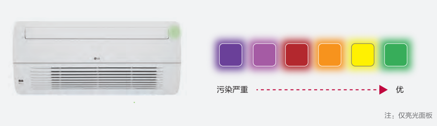 众所周知,空气质量与人类的生活质量、工作效率紧密挂钩。因此为室内源源不断输送新鲜空气,为员工健康保驾护航,亦当成为楼宇办公关注的重点。LG中央空调创新研发的多款室内机产品,不仅带有净化功能,还能够适时监测室内空气质量。以单面出风天花机为例,产品带有灰尘传感器检测功能,通过面板上不同颜色LED灯显示当前的空气质量,持续检测室内空气变化,让用户对室内空气质量有直观的感知。