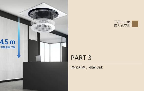 三星360度嵌入式产品可选用新型净化面板(选配件需另行购买),通过细密孔径的初效滤网和静电除尘滤网实现双层过滤,并通过颜色指示灯显示空气质量。