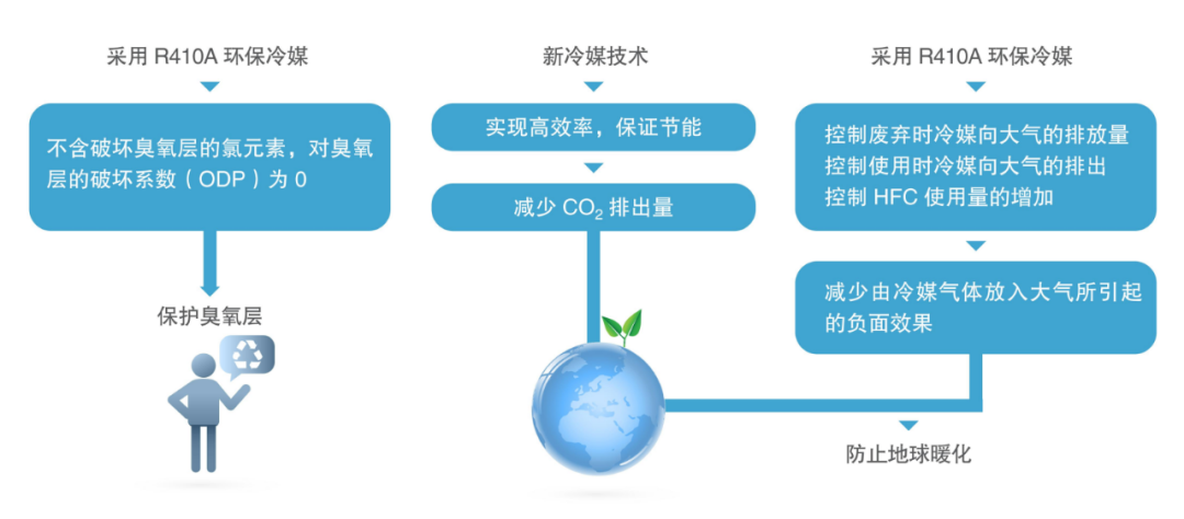 采用新型环保制冷剂R410A,制冷效率更高。另外,R410A环保冷媒不含破坏臭氧层的氯元素,对臭氧层的破坏系数(ODP)为0,并且还可以有效减少CO2的排放。
