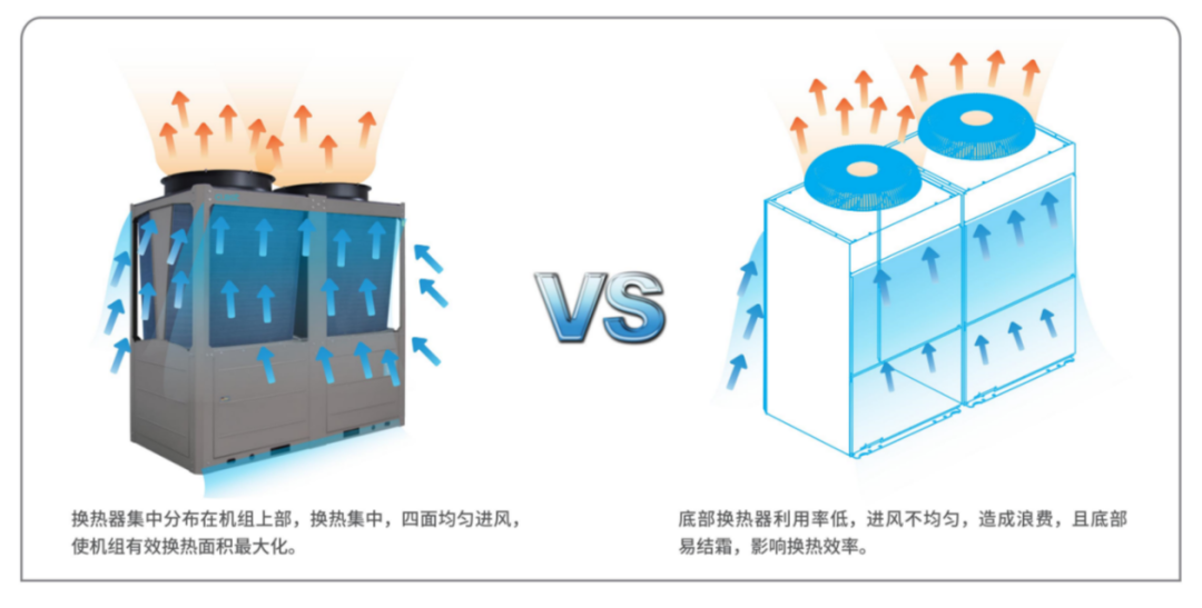 换热器根据专业的温度场模拟计算,创新设计环形回风,进风面积大,换热有效面积增加,换热效果显著,而且冬季机组底部不易结霜。
