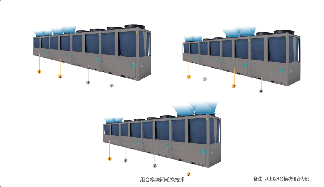 机组根据系统使用负荷情况,轮换设置优先开启的模块机组,平衡分配每台模块机组的运行时间,大大提升机组的可靠性。