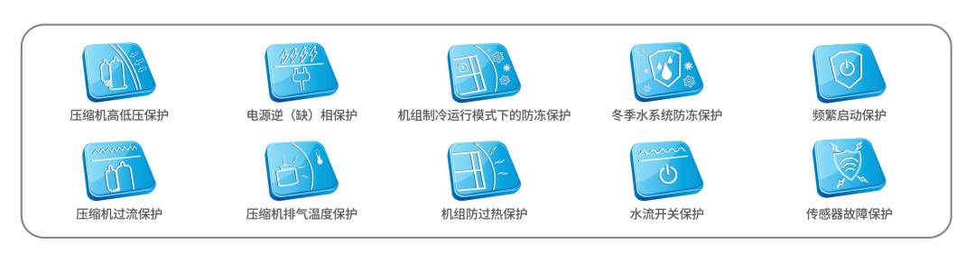 采用模块化结构,机组分级启动,减少机组启动电流对电网的冲击,机组自带高低压开关、防冻保护装置、流量控制器、过载保护装置、电源相序保护装置等,并配有运行控制装置,出现故障时,控制器进行实时自动报警。