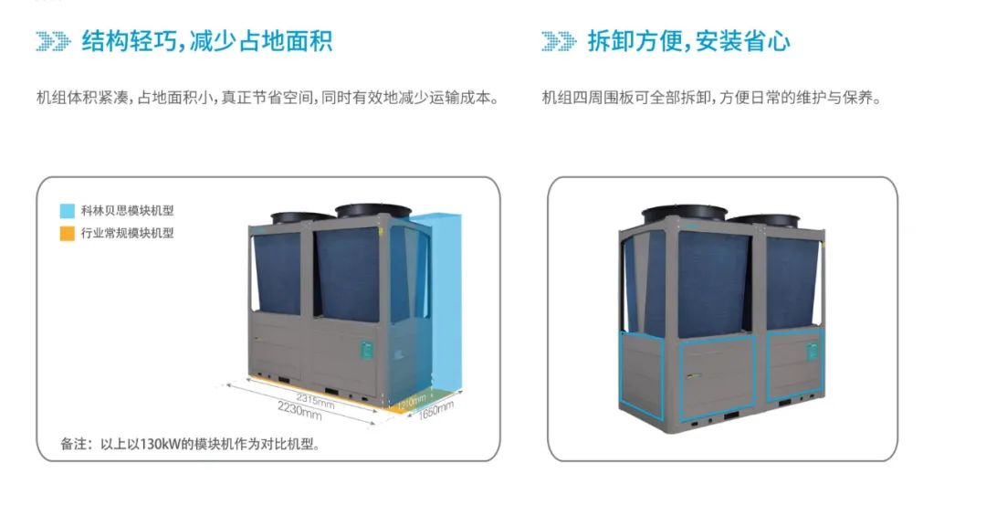 科林贝思秉承环保先行,效率至上的设计理念,融合了最新科技与精湛工艺,研发出的全新一代直流变频风冷热泵模块机,拥有更加优秀的性能和更全面智能化的功能 。时尚高端,简而不凡。