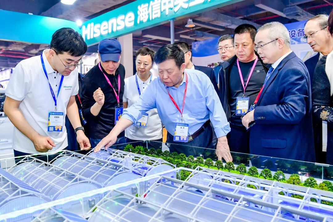中国工程院院士、菌学专家李玉参观海信展位,并交流了解海信磁悬浮多联式食用菌养殖产品解决方案