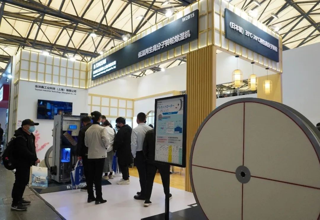 东洋桑携高分子全气候空调、低温再生高分子转轮等亮相展会,低温再生高分子转轮吸湿能力是普通转轮的两倍、35-70摄氏度低温再生、耐久性好,十年性能无衰减、不吸附恶臭分子、抗腐蚀、耐酸盐碱、抗细菌霉菌等。独特的造型吸引参展观众驻足观看。