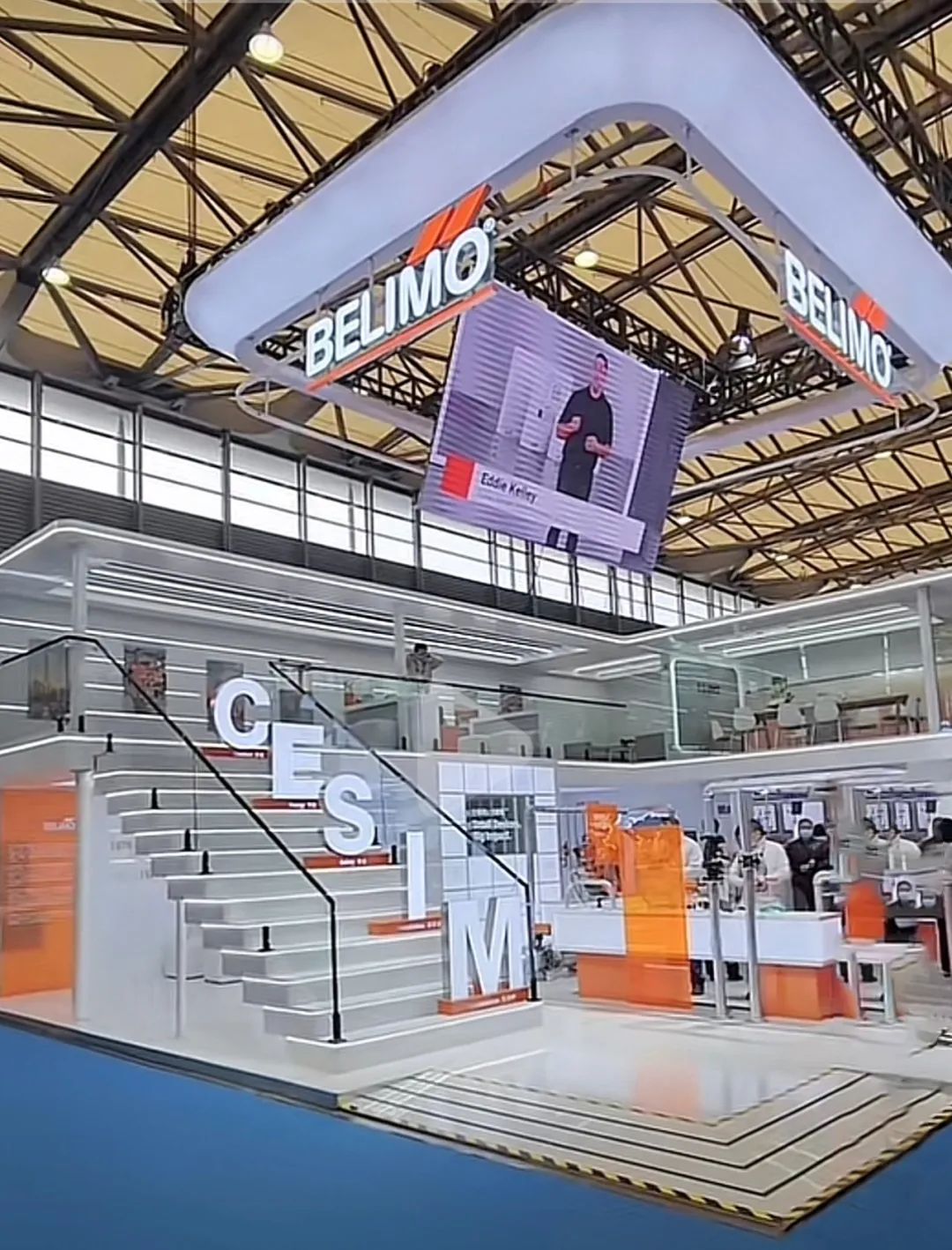 本次展台设计采用经典的橙白色系,设有品牌历史概览墙、产品设计理念CESIM楼梯、全球地标案例展示区、垂直市场应用展示区、新品展示区等。