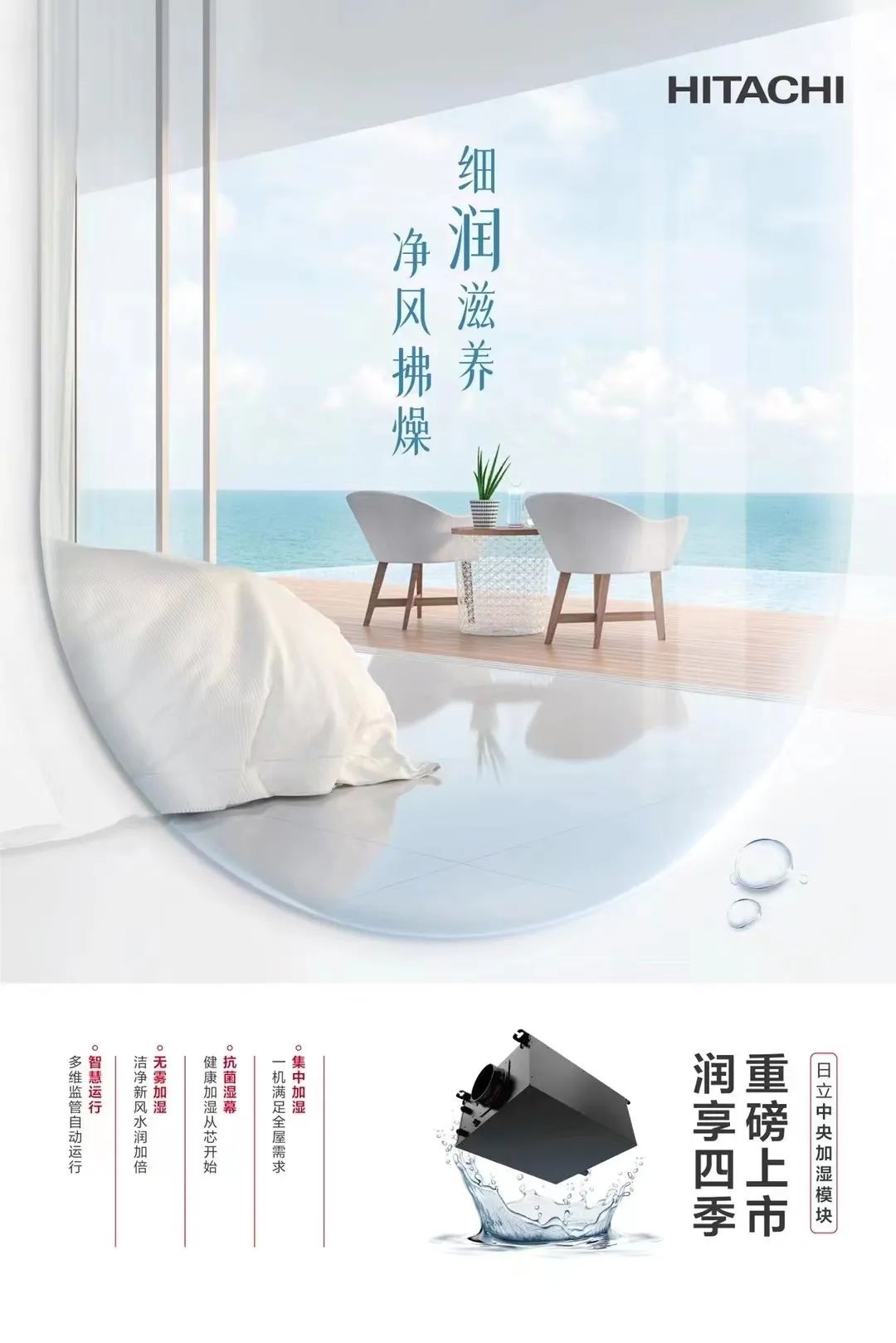 日立天净系列新风换气机可搭载中央加湿模块,实现全屋集中加湿。采用冷蒸发原理,将水分以气态分子形式融入新风,输送至全屋。