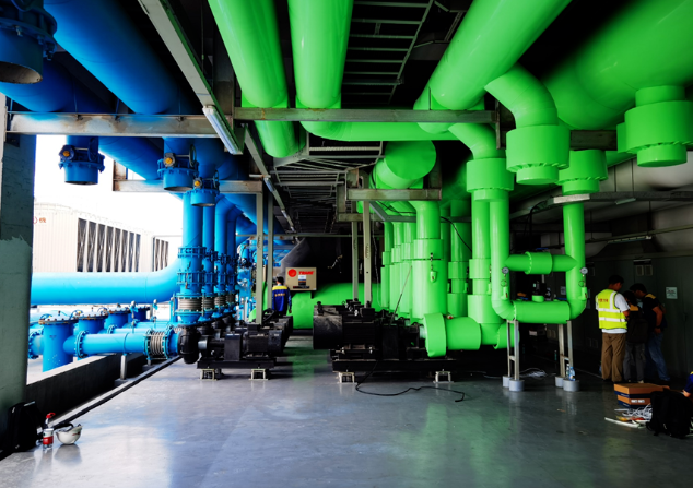 其中低温系统冷源采用1台1000RT变频离心冷水机组+2台1000RT定频离心冷水机组。中温冷源系统采用1台1000RT变频离心冷水机组+2台1000RT定频离心冷水机组。空调冷冻水循环泵、冷却水循环泵选用国际知名品牌产品,配套采用IE3等级电机,整泵效率大于80%;与普通类别水泵相比,提升10%以上效率。空调冷却水塔选用低飘水率的超低噪音冷却塔,冷却塔风机采用变频控制,确保系统高效、节能、稳定运行。冷源系统配套特灵机房群控系统,中央冷源能管系统,实时监控冷水机房中的设备运行、故障报警及系统运行能效记录。