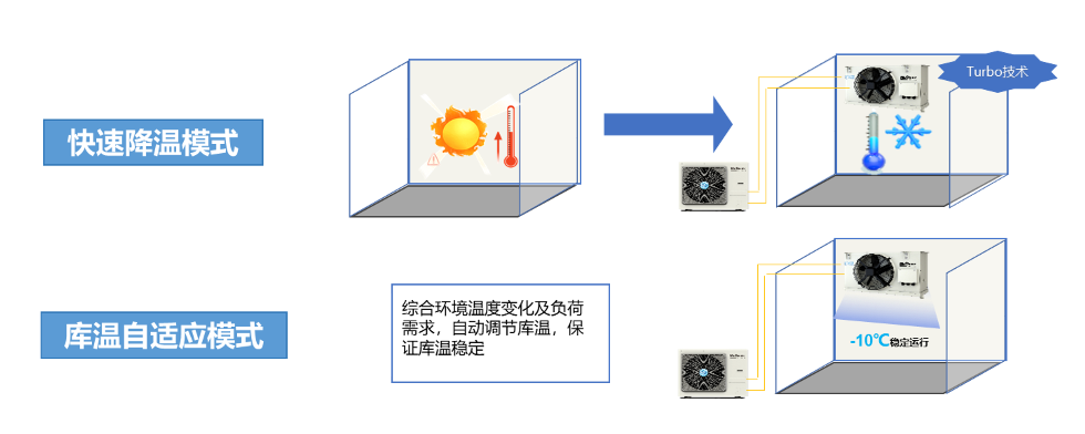 拉库双模式可选:可选快速降温和库温平稳自适应两种模式,满足货物冷冻、冷藏的不同需求。