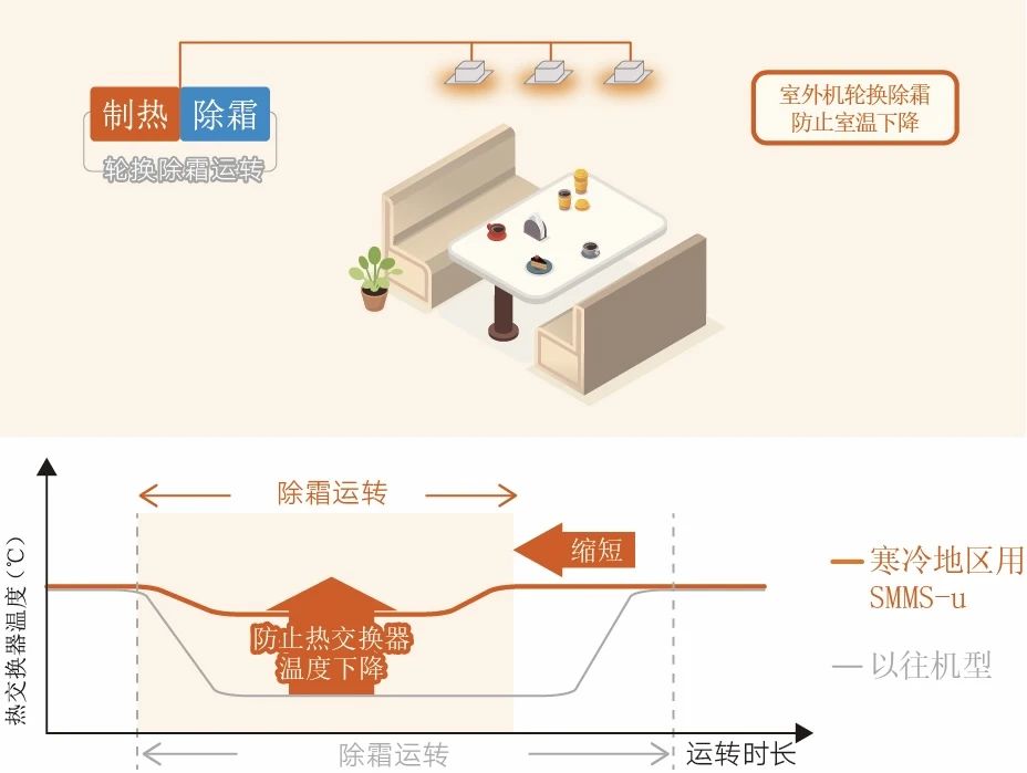 此外,设备还配备室外机轮换除霜功能,可以有效防止室温下降,始终提供舒适稳定的温暖体验。