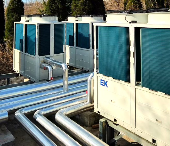 EK团队深入分析项目需求,共配置24台EK超低温空气源热泵机组,结合“超低温性能+模块化设计+智能调控”三大技术优势,为每栋建筑量身定制绿色智能解决方案。