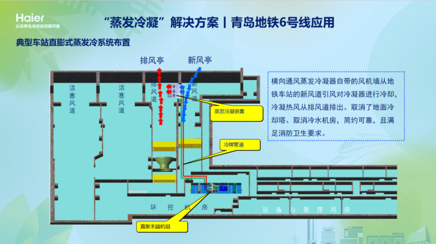 作为中国首个地铁全自动运行系统示范工程,青岛地铁6号线设计之初不仅提出舒适、节能需求,还要求减少设备占地面积,以降低整体建设预算。海尔智慧楼宇因地制宜,和青岛地铁方以用户共创方式,为其提供直膨式蒸发冷解决方案,实现高能效、低能耗的用户升级体验。