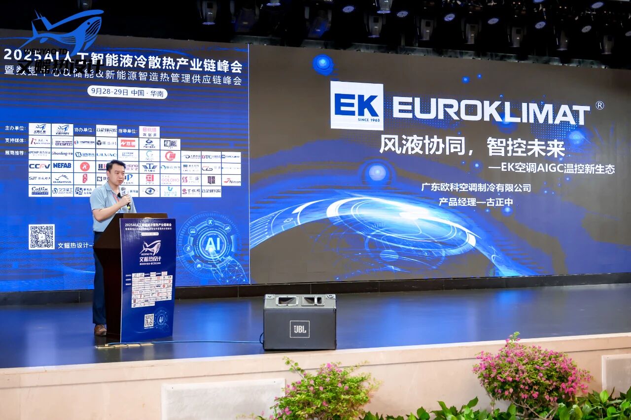 在“数据中心液冷CDU及液冷组件能效技术创新”专题会场,EK数据中心产品经理古正中发表题为《风液协同,智控未来——EK空调AIGC温控新生态》的专题报告。