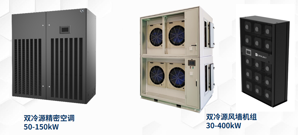 双冷源空调方面,EK提供双冷源精密空调、双冷源风墙机组。机组共用液冷冷源,水盘管供预冷及自然冷,节能提升30%;超大换热面积低风阻盘管,风机功耗下降50%;高水温大温差设计,水泵功耗降低20~50%。