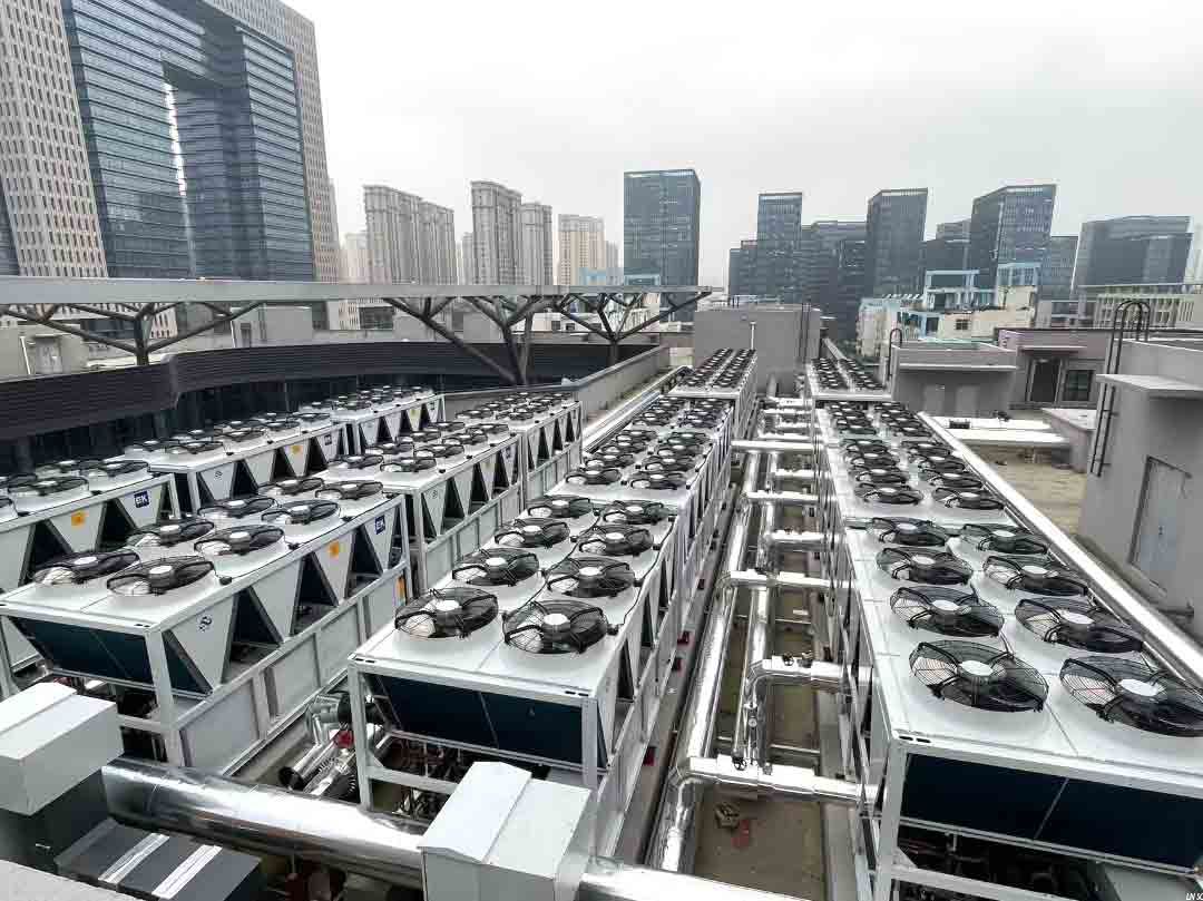 面对复杂需求,EK空调为该大商业综合体配置17台大型变频超低温热泵机组,搭配EK-AIoT智慧云系统进行数智化运维,总制冷量达8840kW,总制热量达9554kW,全面覆盖项目多元负荷需求。