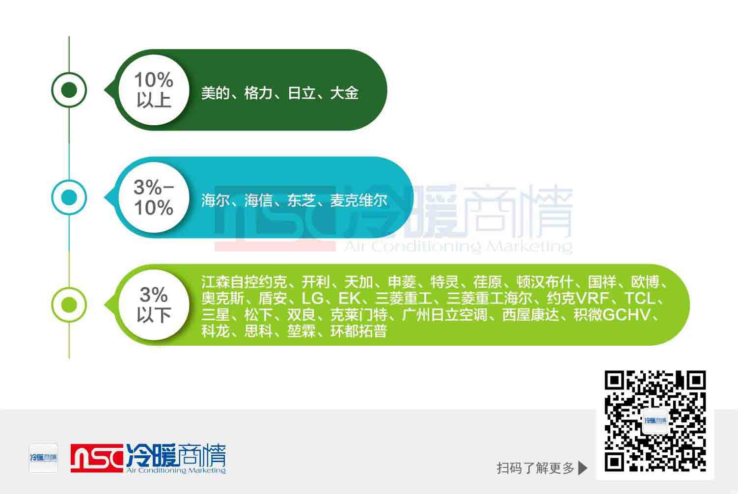 品牌竞争层面,市场梯队分化清晰。美的、格力、日立、大金稳居第一阵营,份额均超10%;日立凭借技术优势、项目交付能力与全场景解决方案,稳居外资品牌在工装多联机市场第一,在商业综合体、高端办公、医疗教育等核心场景中占据领先地位。海尔、海信、东芝、麦克维尔等品牌处于3%-10%区间,形成第二梯队。