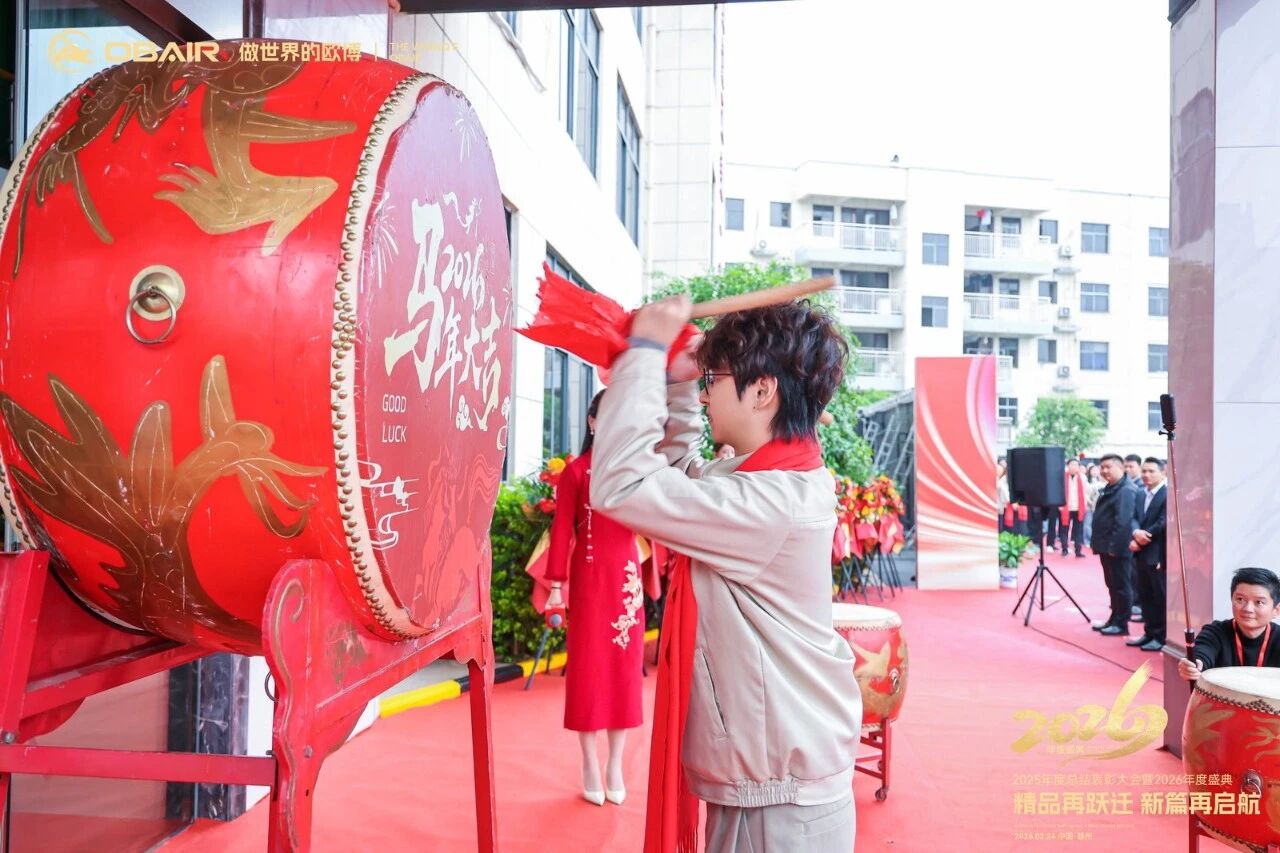 最激动人心的时刻到来了。欧博空调CEO吕思浩稳步走向那面巨大的战鼓,手握鼓槌,敲响2026前进战鼓: