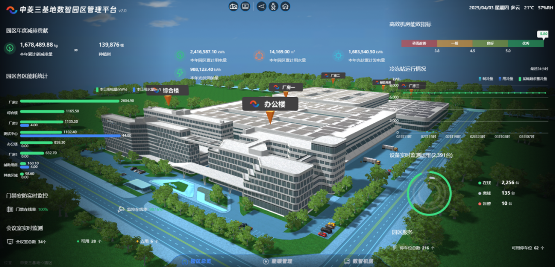 依托申菱环境自主研发的申菱物联平台,实现园区能碳与环境数据的实时采集、智能分析和精准调控,全面提升园区碳排和能效管理水平。