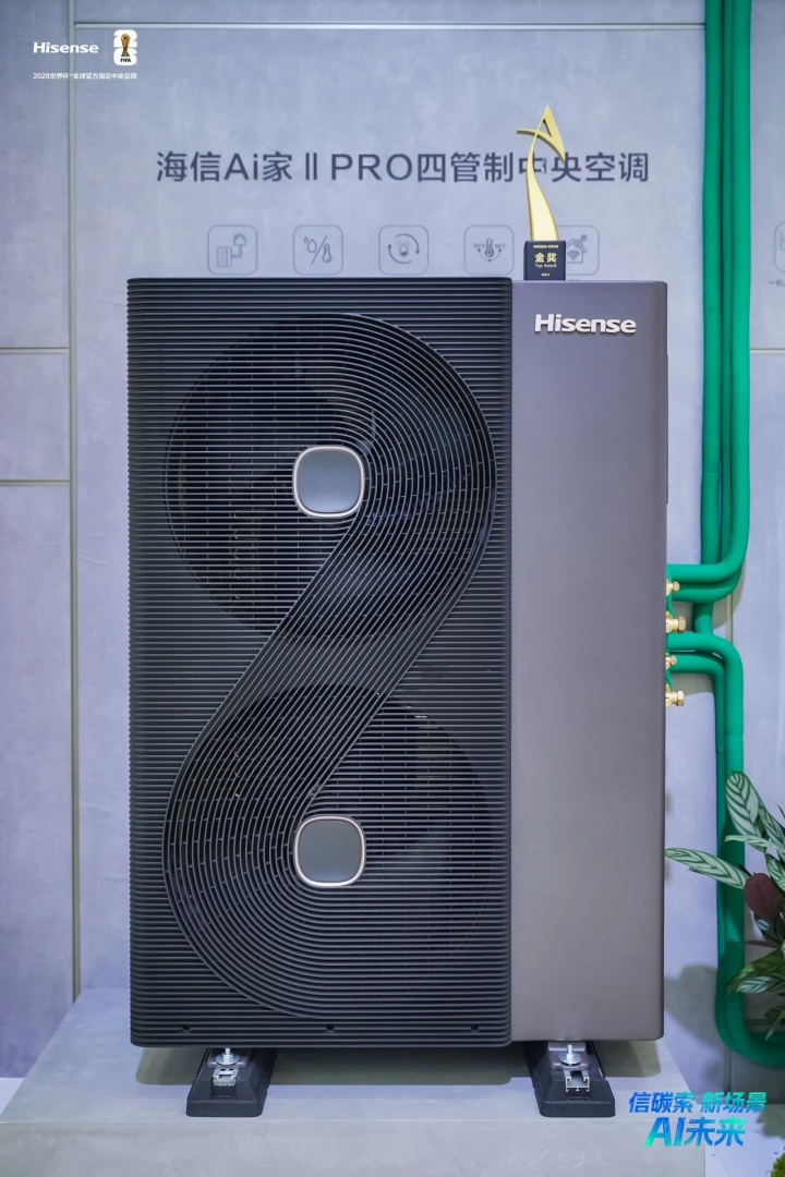 当传统中央空调的核心价值不再局限于制冷制热,而是延伸至温度、湿度、新风、净化、热水、智控等全维度。海信中央空调以灯塔品质为基础,以Ai科技为驱动,推出海信Ai家II PRO。作为ThinkAir 2.0全屋健康智慧生态系统的核心产品支撑,同时也是2026世界杯定制产品,海信Ai家II PRO是行业首款6合1四管制中央空调,该产品集空调、地暖、温湿双控、新风、热水、全屋智控六合一,一套系统化解决方案精准满足用户多元场景下的居家生活需求。凭借其卓越的品质,海信Ai家II PRO斩获全球智慧生活领域“奥斯卡”艾普兰金奖,收获行业与市场的双重高度认可。