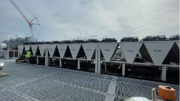 不止服务国家级算力中心,海尔在全球数据中心市场同样展现出领先优势。马来西亚某数据中心项目 I 期原采用普通风冷螺杆方案,PUE>1.45。海尔以风冷磁悬浮为核心,配置48台主机,总冷量22816RT,将风冷段PUE降至1.38,主机COP达4.5,且可在极端温变工况下稳定运行,最终一次性通过8家数据中心专业团队验收,以硬核实力彰显全球竞争力。