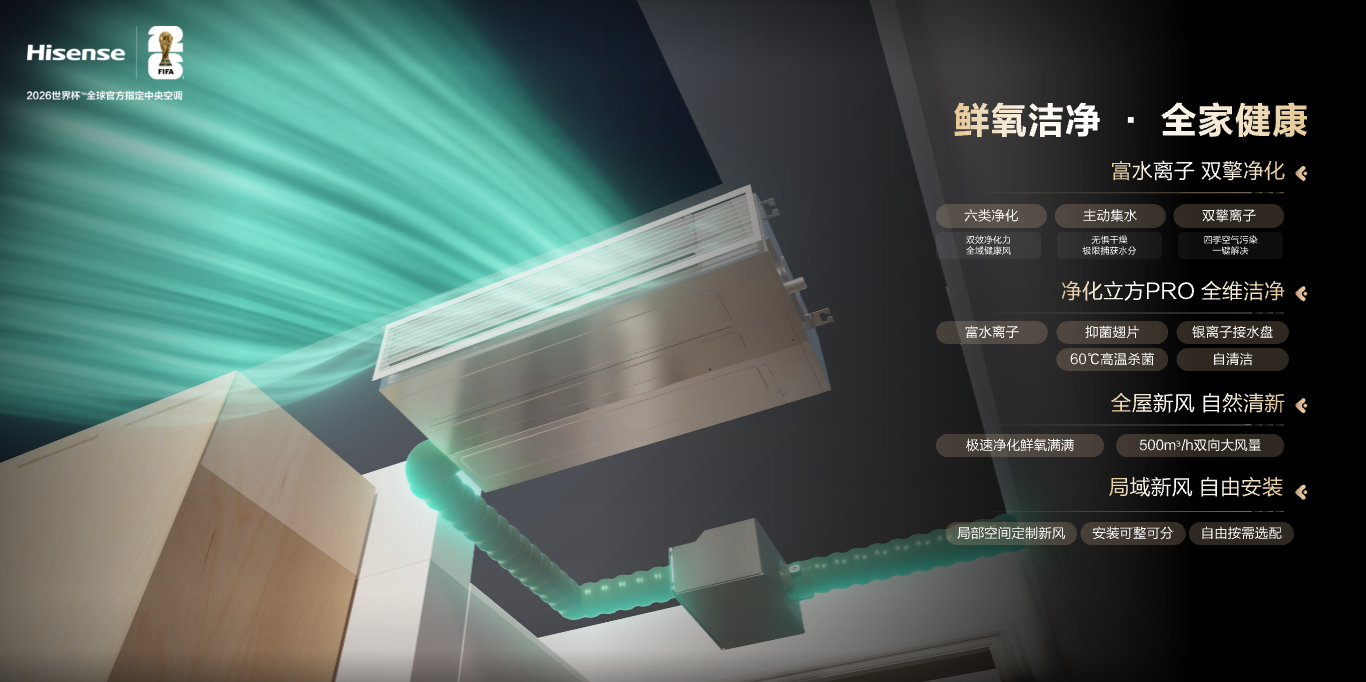 集成无界,智享无扰。海信5G中央空调Ai家IIPRO以多项创新科技深度融合,重新标定高端家庭空气管理的全新标准,真正做到以四管驭万象,以AI筑舒适,让科技的温度,温柔融入全屋每一寸空气、每一个角落。