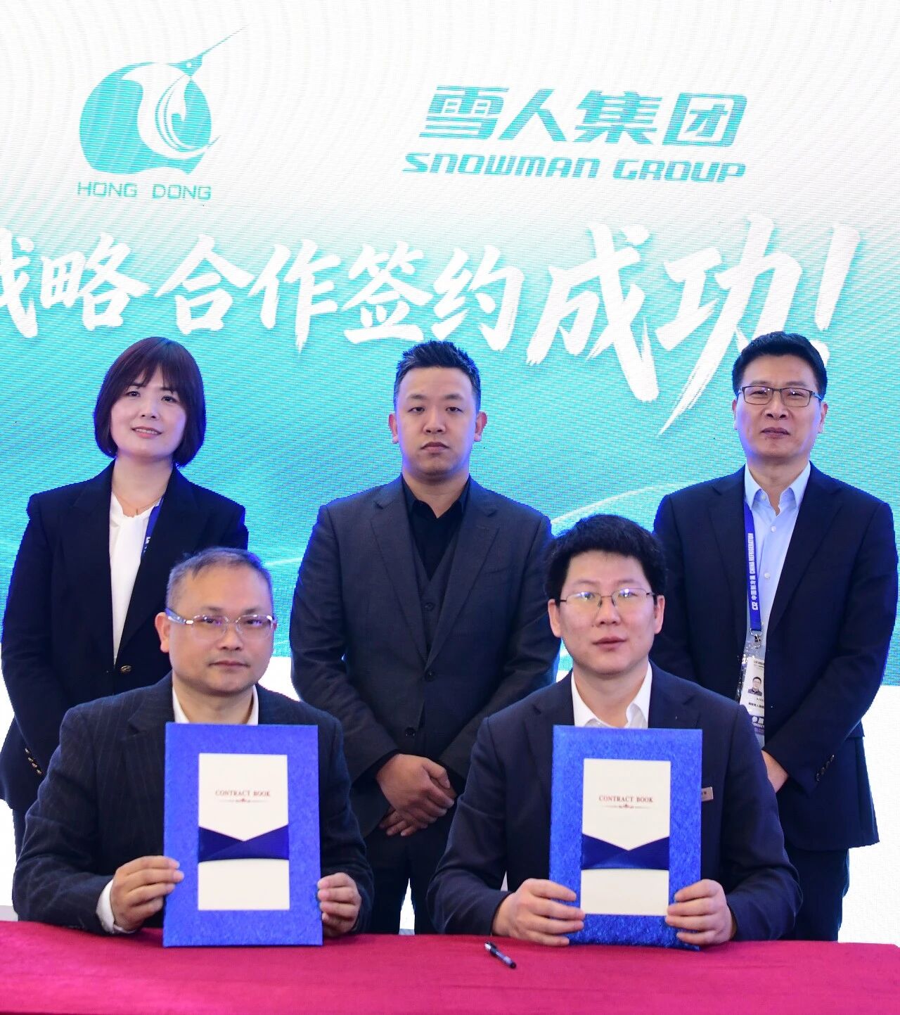 在仪式上,雪人集团与携手二十年的战略伙伴——宏东渔业股份有限公司,迎来了合作史上的又一高光时刻。宏东总裁兰潇鑫、副总裁林金航出席雪人展台现场,进行与雪人集团的战略合作协议签约。