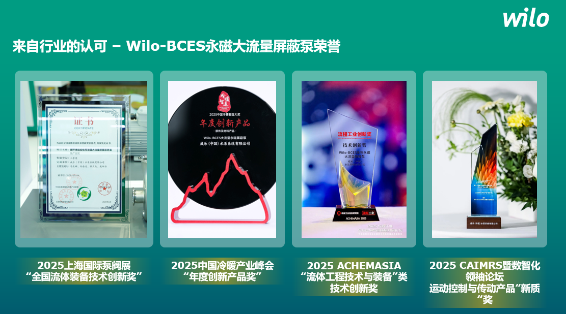 2025年上市发布后,Wilo-BCES系列大流量永磁屏蔽泵已经斩获多项行业殊荣,彰显了产品的技术创新、行业领先和商业价值。