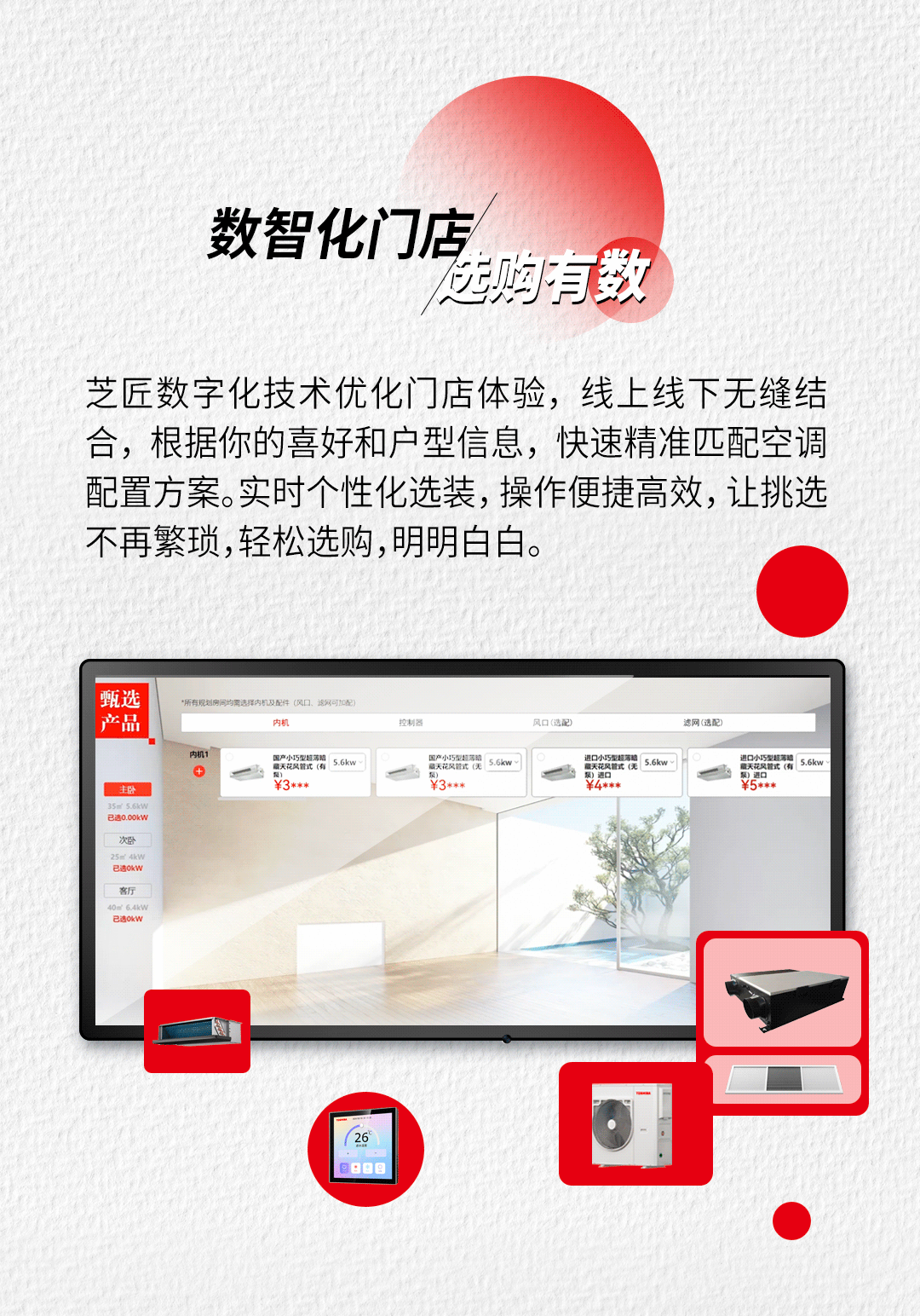 东芝空调芝匠安装数字化平台打造的“数智化门店”,通过线上线下无缝衔接的模式破解难题。用户输入户型信息与个性化喜好后,数字化系统快速精准匹配空调配置方案,实时生成个性化选装建议。无需繁琐比对与反复沟通,系统即可实现方案的高效优化,让选购过程从“被动接受”变为“主动掌控”,真正做到明明白白消费、轻松便捷选购。