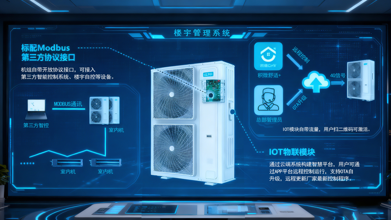 物联模块实现对设备的远程控制,无论身处何地只要网络联通,都能实时掌控楼宇内每一台空调的运行状态。