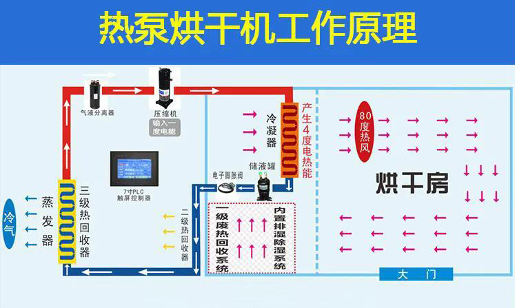空气能热泵烘干设备运行费用仅为传统干燥设备的1/4-1/3,并且可大大减少人力管理成本,干燥工艺节能、高效,干燥产品质量高,非常适合于烘干温度在75℃以下的物料等。同时,应用热泵可有效利用能源、保护环境、减少温室效应和防止臭氧层破坏,是一种非常环保的烘干干燥设备,应用于干燥过程不但可以降低能耗,而且对节能环保,节约能源有着重要的意义。