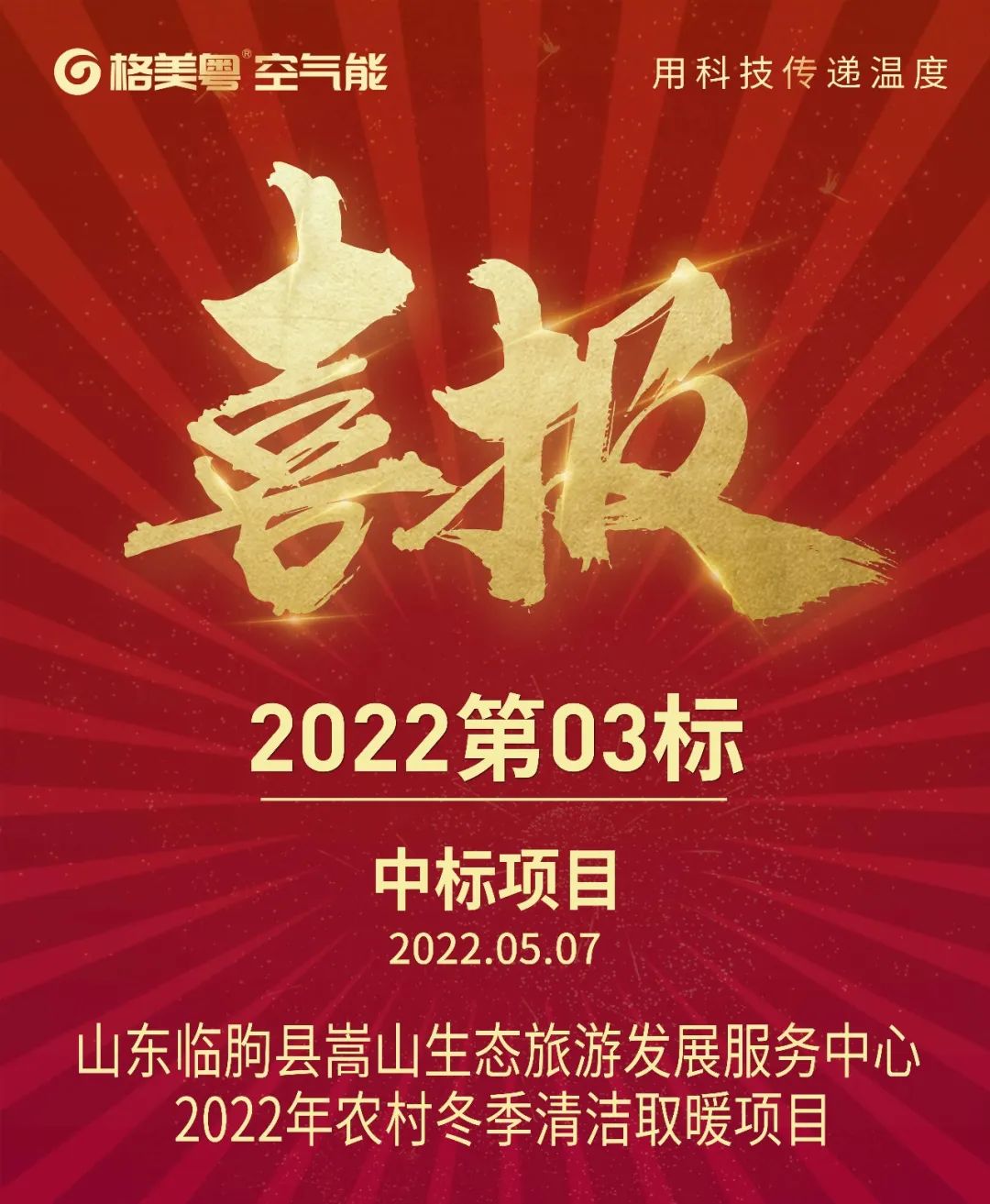 好消息!今日,格美粤空气能总部传来中标山东潍坊临朐煤改电项目喜讯,并且以第一候选人身份强势中标,彰显格美粤空气能优秀的品质与强大服务优势。