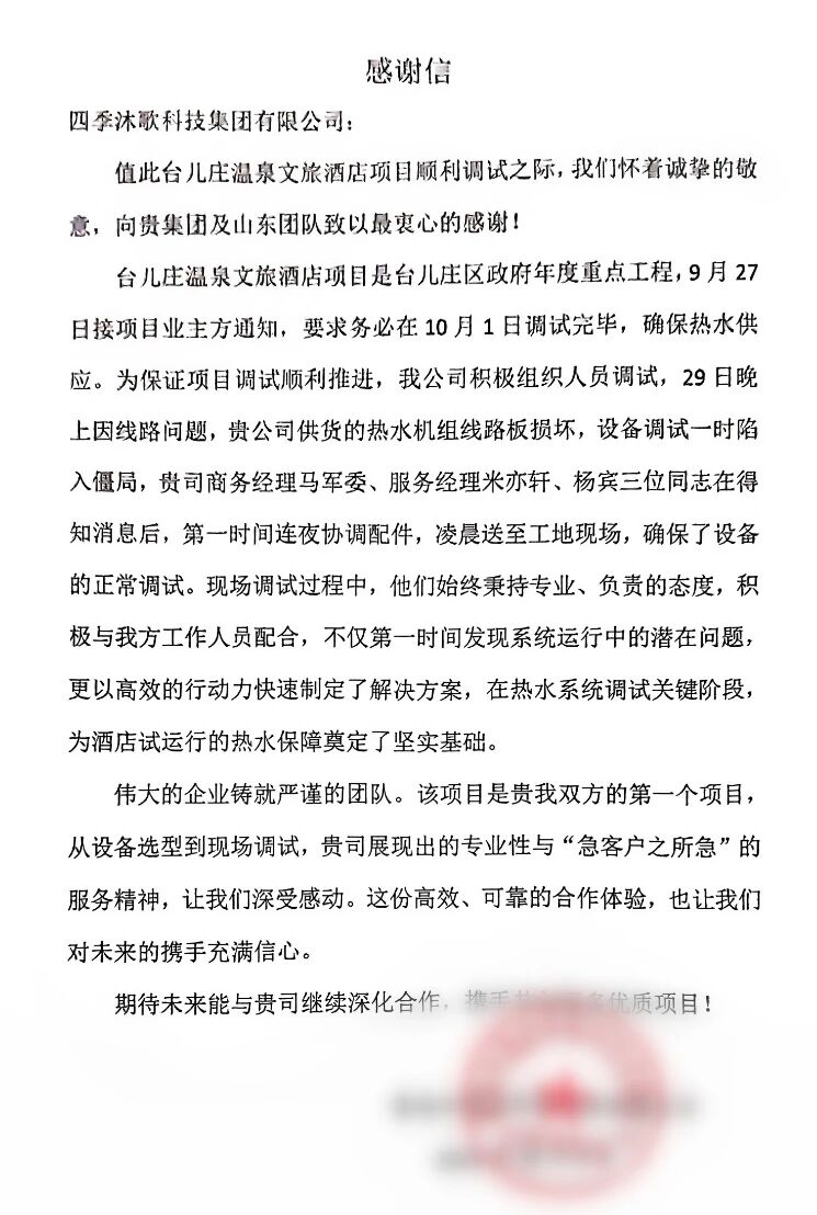 为赶工十一黄金假期的关键时间点,9月底台儿庄温泉文旅酒店热水项目现场,当地工程服务公司正加班加点进行设备的安装、调试工作,但由于线路操作不当,导致四季沐歌部分热泵热水机设备无法正常启动,调试工作陷入停顿。顶着工期迫近的巨大压力,工程服务公司负责人深夜拨打了四季沐歌山东济南营销中心团队对接人的电话,了解清楚原委后,四季沐歌服务团队立即往项目现场进行处理,协助工程服务公司提前完成项目热水的调试工作,并给予标准化操作的建议、帮助排除系统运行的潜在问题。通过此次事件,四季沐歌专业化服务给工程公司留下了深刻印象,奠定下工程公司与四季沐歌长期合作的信心。