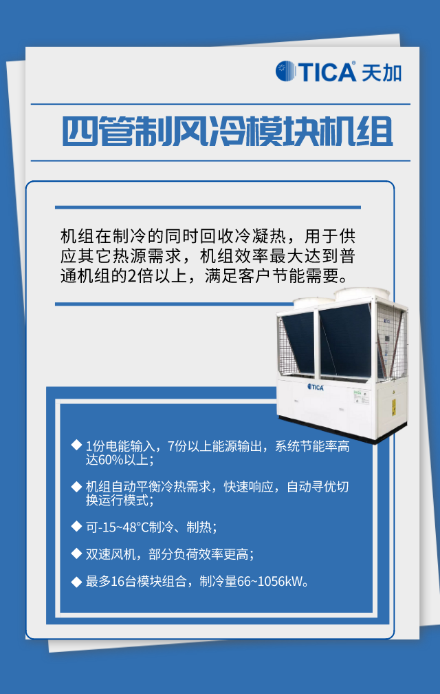 采用四管制风冷模块机组,可以精确匹配系统冷热需求,在提供冷源的同时回收冷凝热量,取代电加热,做到多能互补。