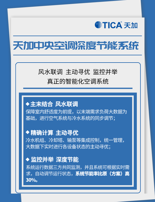 在此基础上,天加提出加入中央空调深度节能控制系统,主动寻优,监控并举,可以让整个空调系统根据运行需求进行负荷调节,节能率在原有基础上提升了30%。