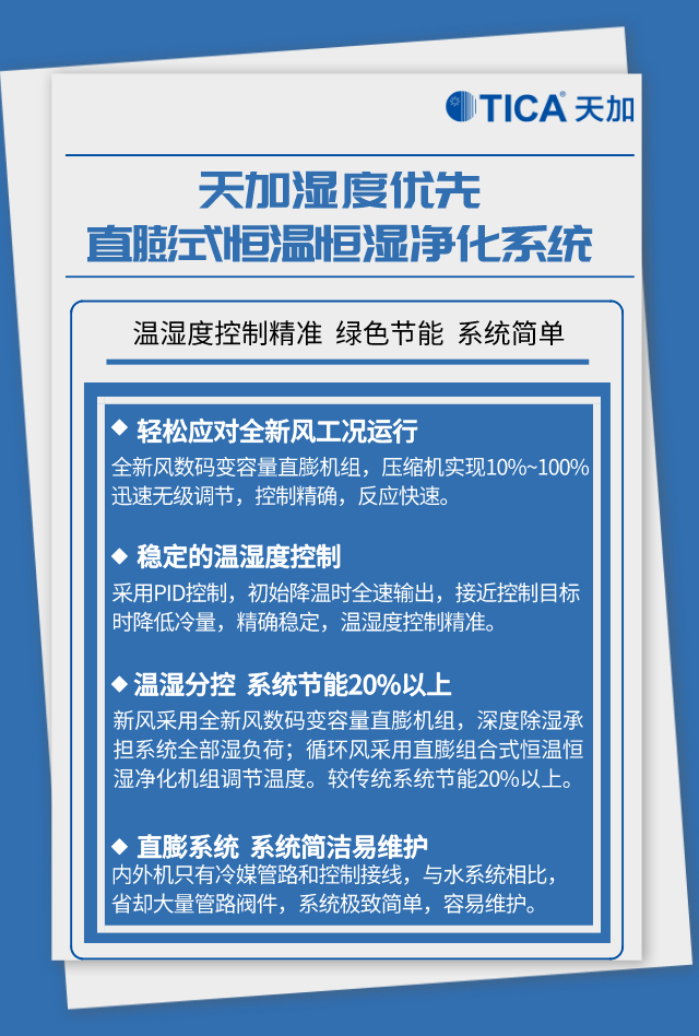 天加提出湿度优先控制直膨净化系统,其中,全新风数码变容量直膨机组处理新风,深度除湿承担系统全部湿负荷,直膨式净化恒温恒湿机组处理循环风,主要调节温度,保证室内的洁净与恒温恒湿,节能率比传统方案提高20%。