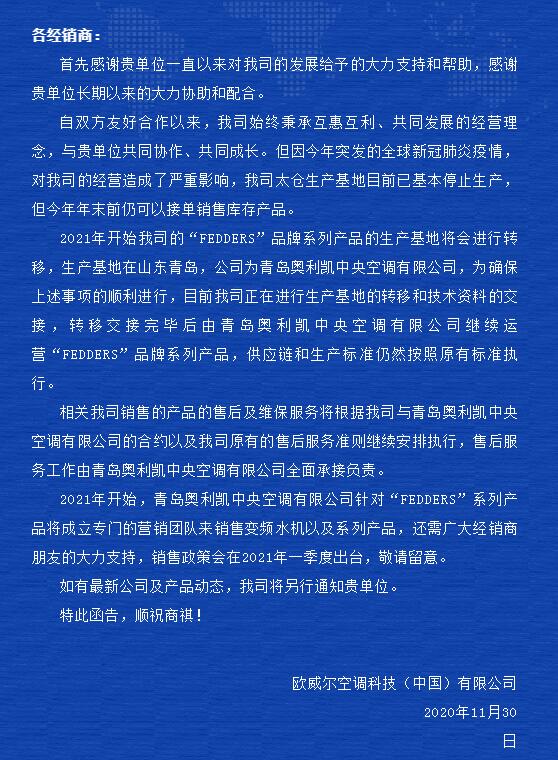 丰隆-奥利凯战略携手,打造FEDDERS品牌新格局
