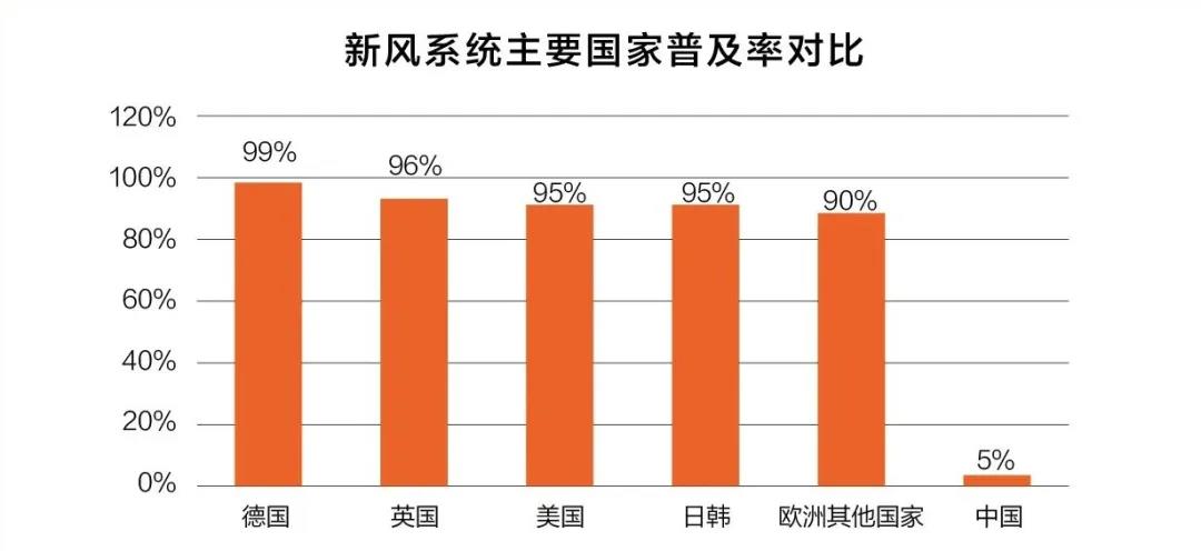 据相关数据显示,目前新风系统在欧美家庭的普及率已经高达90%以上,而我国新风系统市场普及率不足5%,北京、上海、广州、深圳等一些大城市普及率还不到15%,一些省会、二三线城市普及率还不到10%,而农村几乎还是一片空白,从整体市场来看,新风系统在我国民用市场潜力至少在1.68亿台以上。
