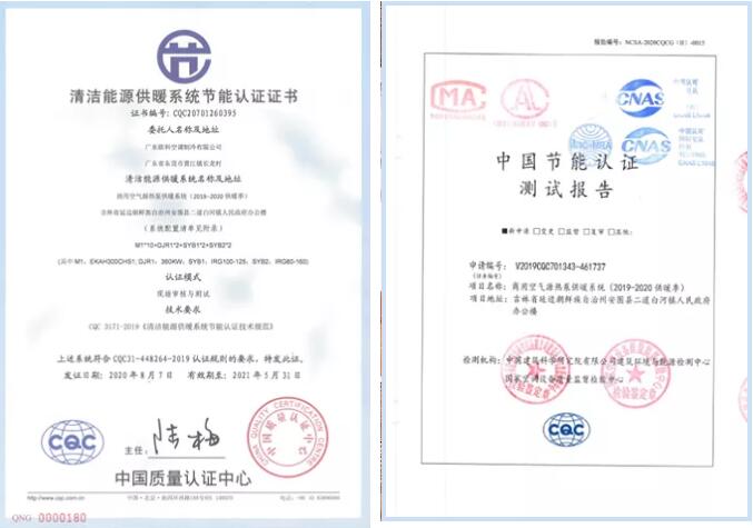 经过监测数据显示,项目室内温度实测值达到23.7℃,系统制热性能系数实测值达到2.11,达到严寒地区的节能系统标准,获得CQC中国质量认证中心颁发的“清洁能源供暖系统节能认证”。