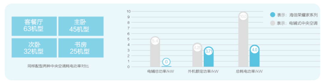 冬天在屋内呼呼吹着空调暖风当然很爽,但跳动的电表数字也着实令人肉疼。很多人感觉中央空调制热时很费电,究其原因上还是空调的“实力”不行,当环境温度太低时,普通中央空调的制热效率会大大降低,只能依赖电辅,才能满足室内机的出风温度要求。而电辅的原理跟吹风机、电热器相同,使用时功率会大幅提升,导致耗电量大增。而海信中央空调荣耀家的无电辅设计,通过多重技术保证制热效果,同等配置下,比电辅制热总耗降低五分之三为用户节约电费开支,同时减少了火灾安全隐患,真正做到安全高效无忧制暖。
